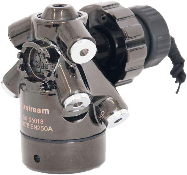 he Airstream Overbalanced and Environmentally sealed first stage is made through a forging process allowing optimized hose routing. The low pressure ports are angled 30 degrees down and 23 degrees out to allow hose routing directly over the shoulders. The high pressure ports are angled down 45 degrees to keep gauges closer to the divers hip and body. This process also allows air flow to be channeled through larger passages combined with the overbalanced diaphragm creates the lowest Work Of Breathing effort (WOB) 0.80 Joules per liter in all conditions and temperatures. Built into the front of the body of the Airstream is a forged heat transfer keeping warmer air inside and forcing cold out allowing this regulator to perform in the coldest conditions where others fail.
