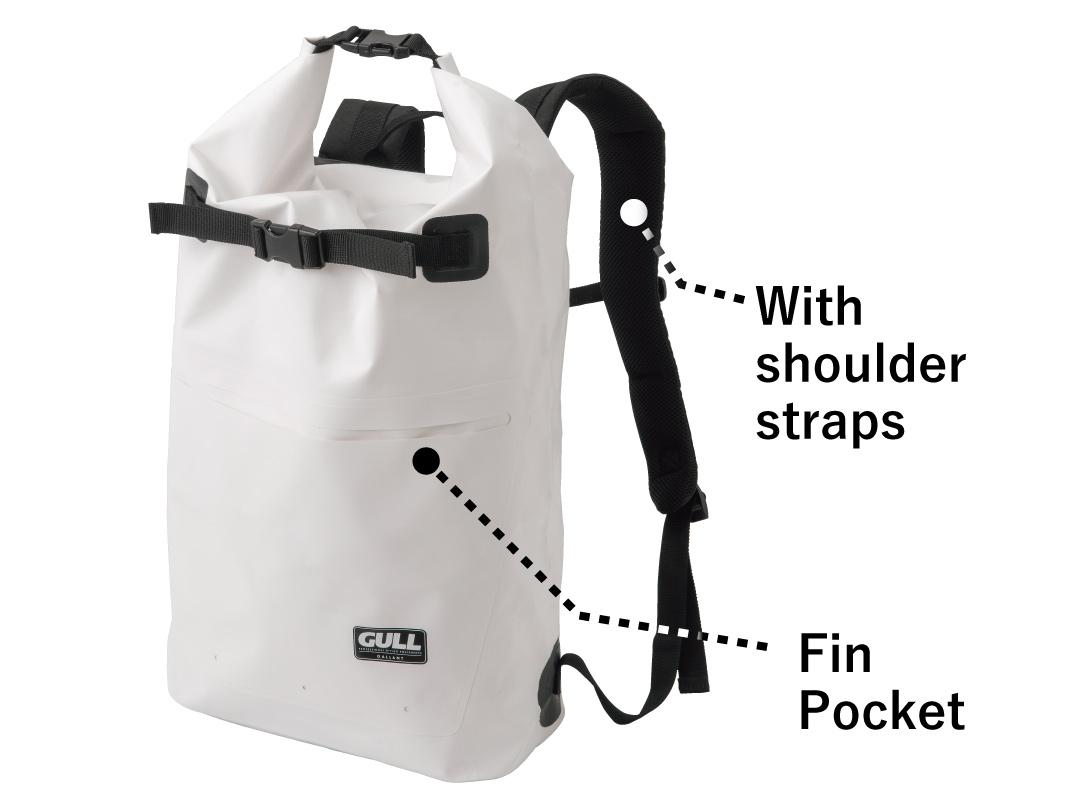 This waterproof rucksack has a front pocket & strap used to securely stow a pair of fins